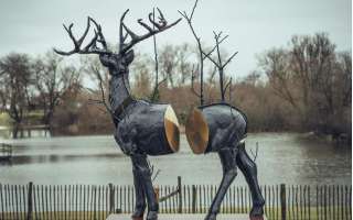 Cette sculpture est fragmentée mais s'intègre également, en partie grâce à la réflexion sur les parties polies, dans son environnement. Monument for Cervus Vitalis #2 (Malus Sylvestris) a été inspiré par les sculptures qui apparaissent fréquemment dans les jardins de devant flamands. Ces statues de jardin quelque peu kitsch sont apparues en même temps que la révolution industrielle.