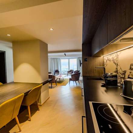 - een familiekamer met 2 slaapkamers, een gedeelde badkamer en zijlings zicht op het strand en de Noordzee